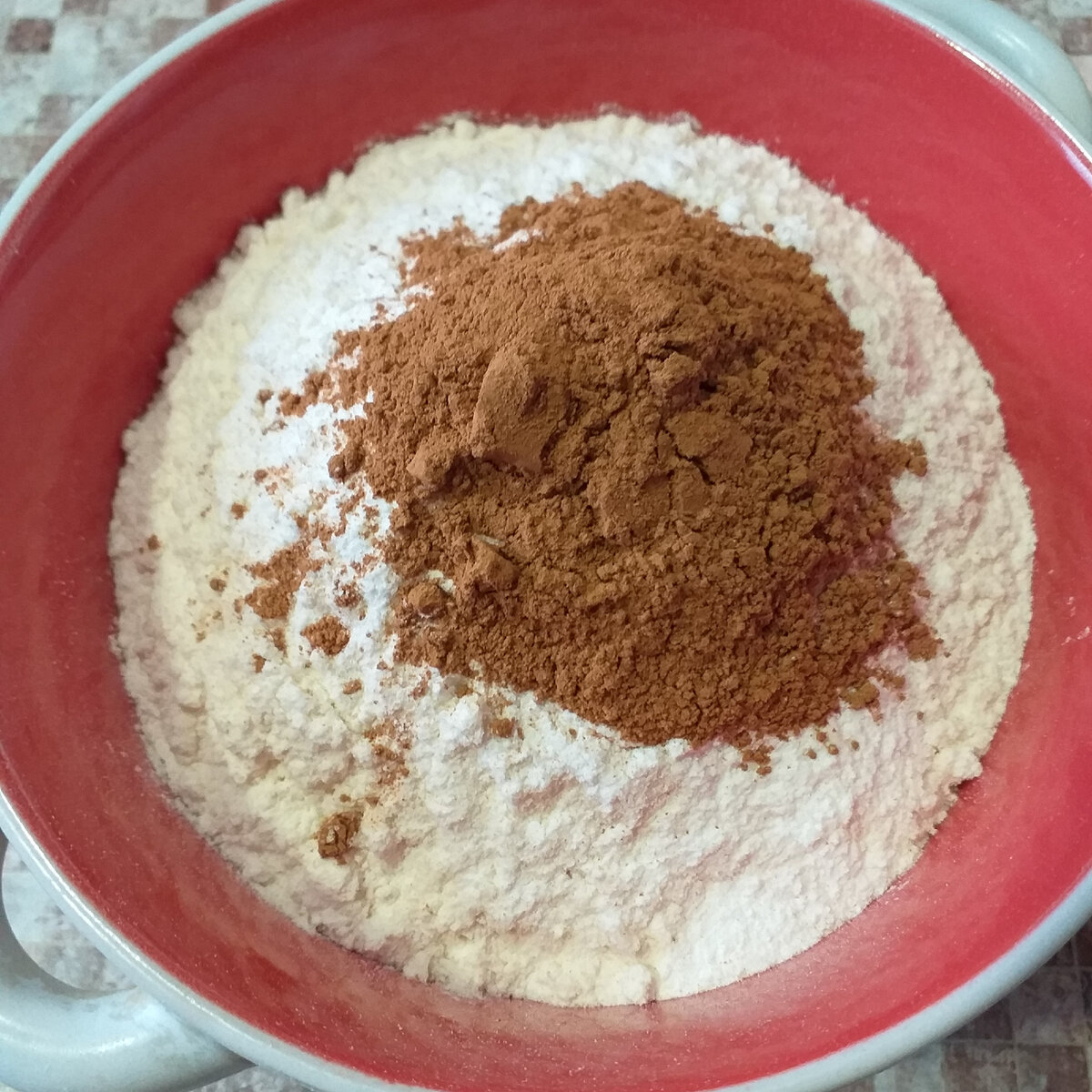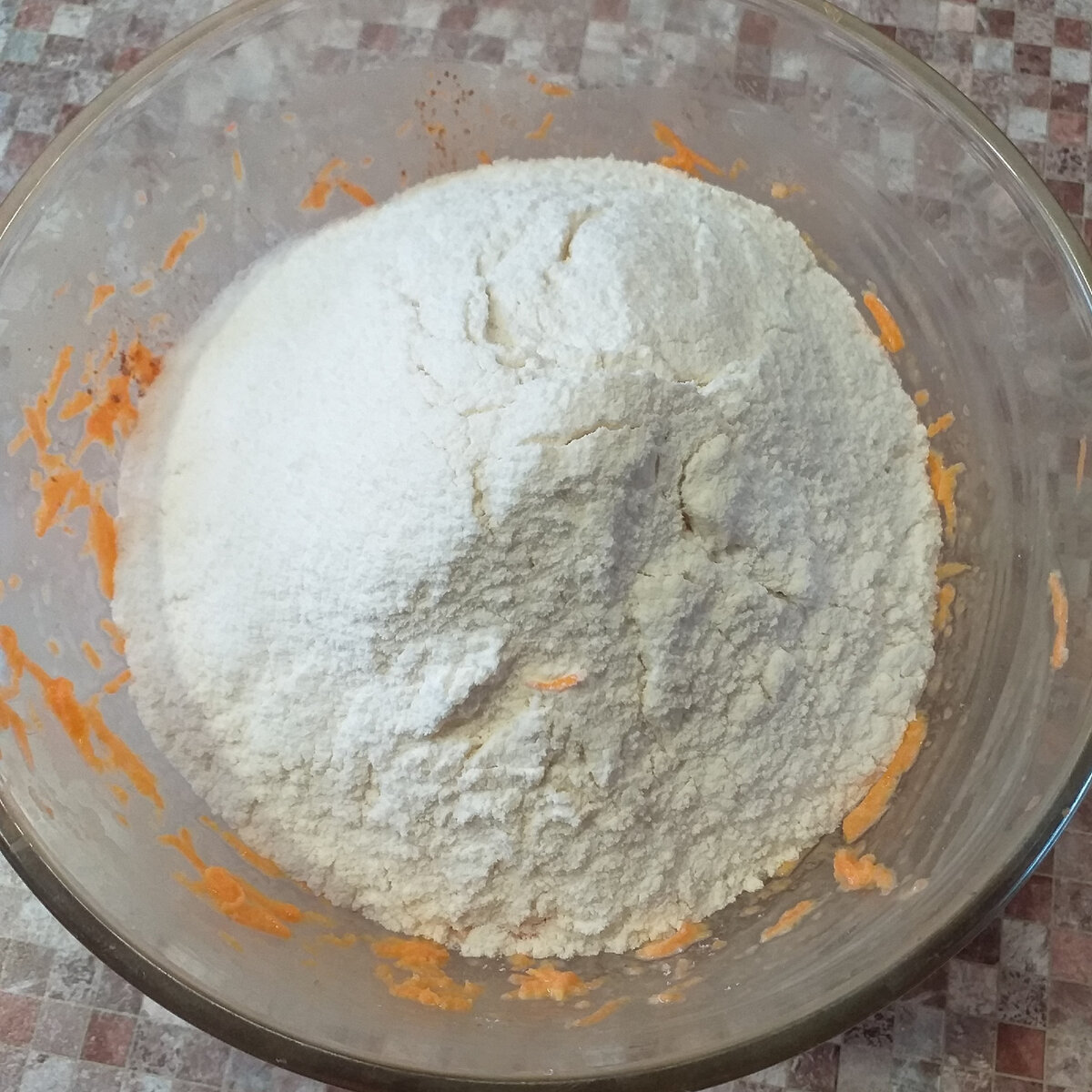 Пшеничне борошно з’єднайте з розпушувачем для тіста і корицею, якщо вирішили її додати. Розмішайте і через сито всипте до моркви зі сметаною і цукром.