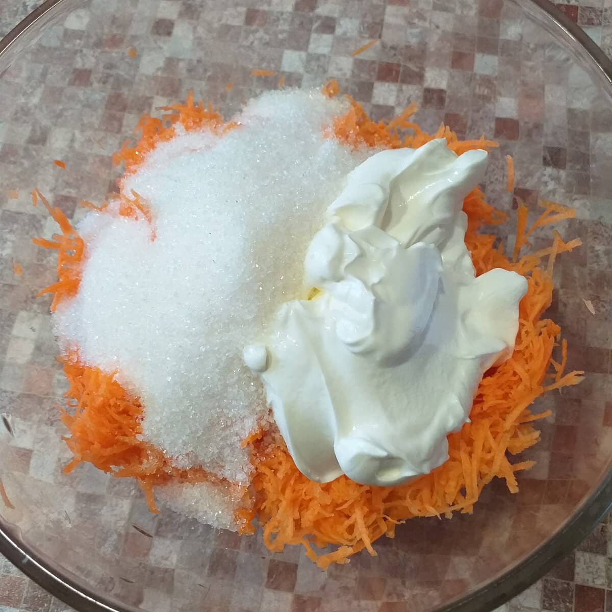 До натертої моркви всипте цукор і додайте сметану ( вона повинна бути кімнатної температури ). Добре перемішайте.