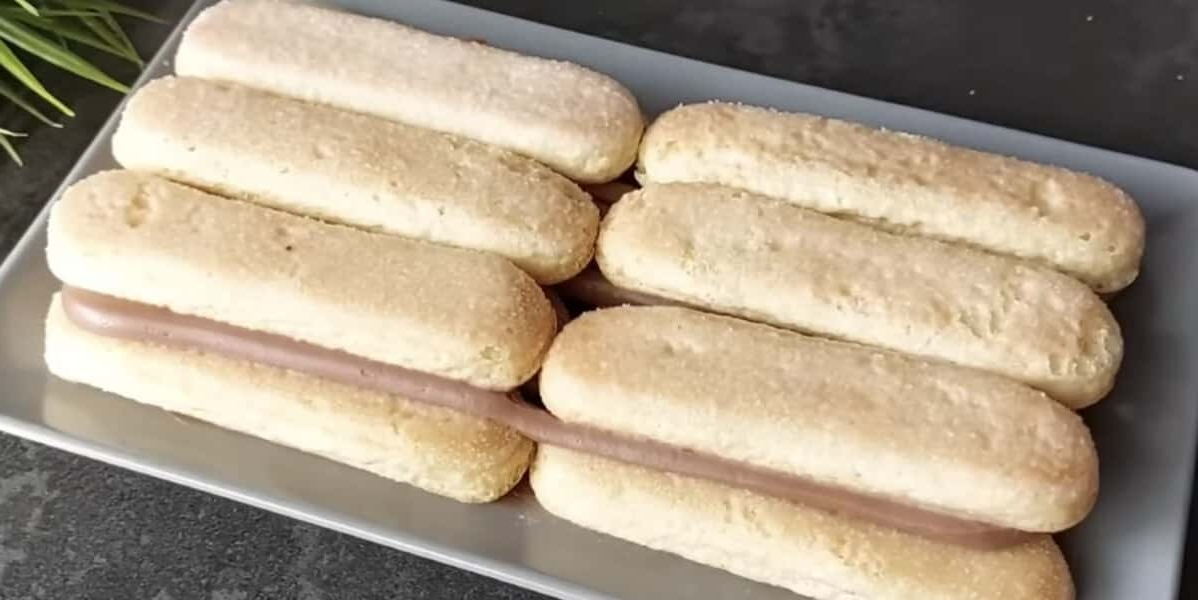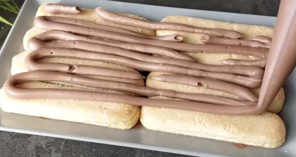 Печиво «Дамські пальчики» вмокаємо в молоці та викладаємо на тарілку поверх шоколадної маси.