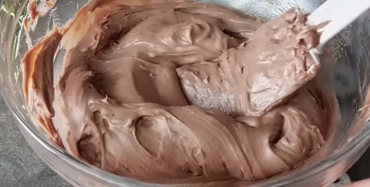 У чашку викладаємо Маскарпоне, шоколадну пасту «Нутелла» та перемішуємо. Перекладаємо в кондитерський мішок, трохи залишивши у чашці.