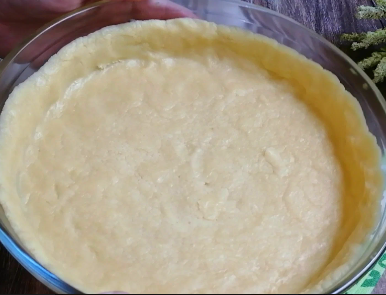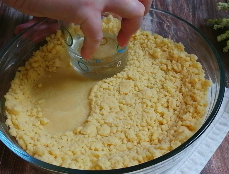 У форму викладаємо 2/3 частини тіста та формуємо основу пирога за допомогою склянки.