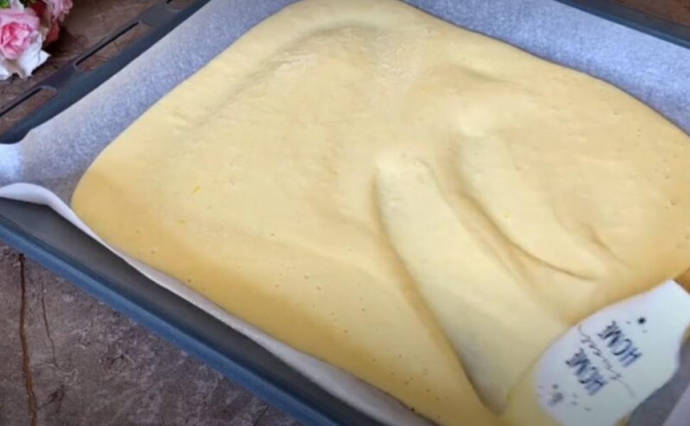 Застилаємо лист 42х32 см пергаментом, виливаємо тісто і розділимо рівним шаром по поверхні.