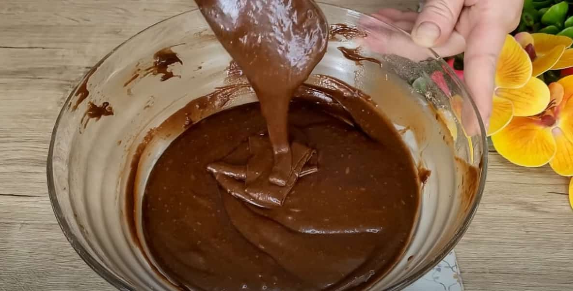 Додайте просіяне борошно, розпушувач і какао. Добре перемішайте лопаткою, щоб не було грудочок.