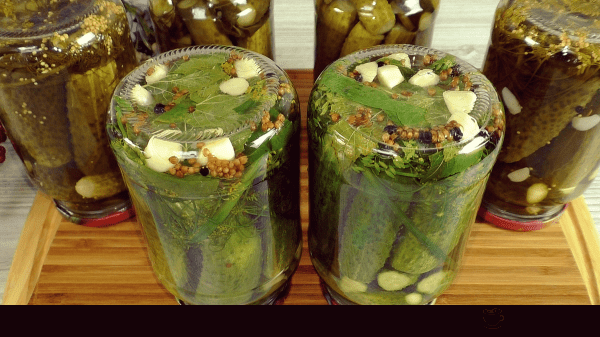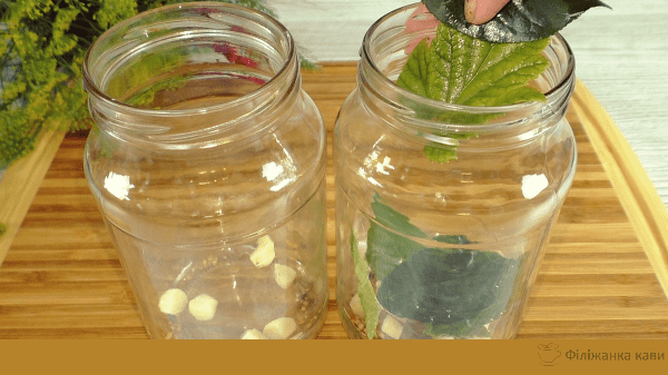 Часник, листя вишні і смородини по 3 штуки на банку, можна брати листя хрону, що є під рукою.
