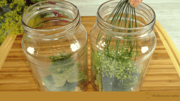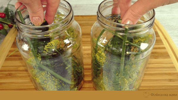 Тепер додаю парасольки кропу, вони надійно “зафіксують” спеції на дні банки.