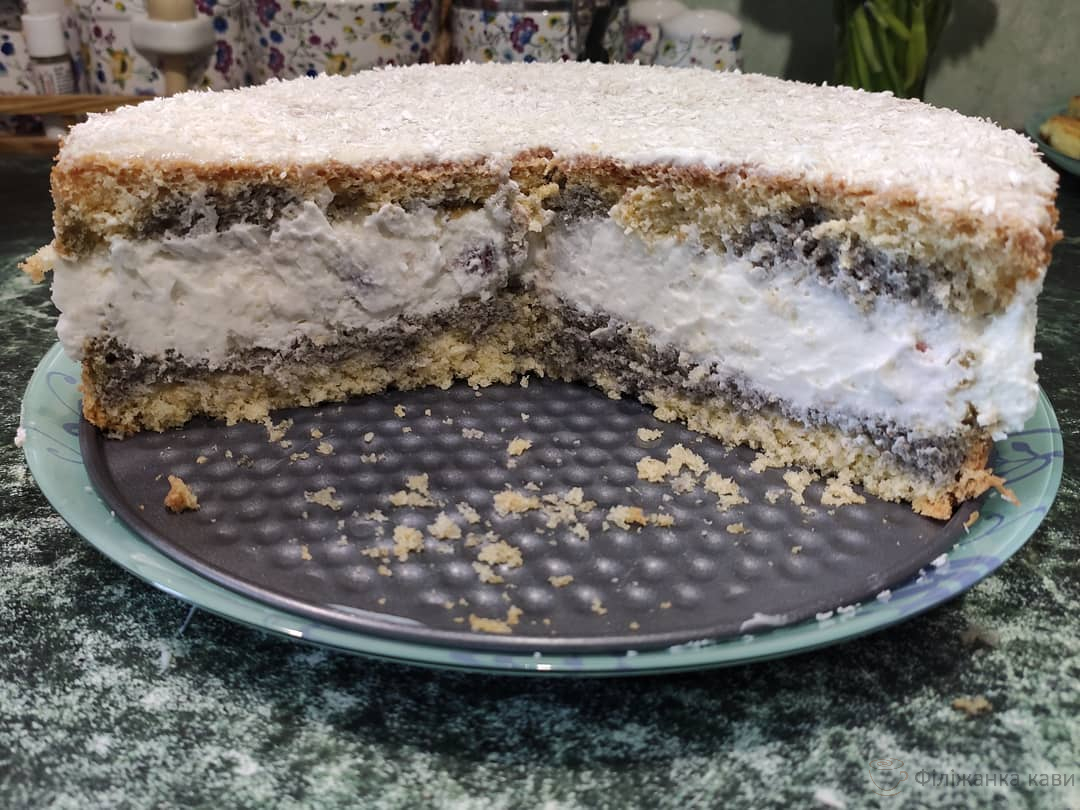 Лінивий, бо пекла на скору руку, імпровізувала. Форма 24 см, один корж – перерізала на два, не люблю так робити, але часу не було пекти два. Те саме з кремом, що було вдома з того і зробила, пропорції вимірювала виходячи з наявності того, що було в мене. І, до речі, крем вийшов ну дуууже ніжний, на смак нагадує пломбір.