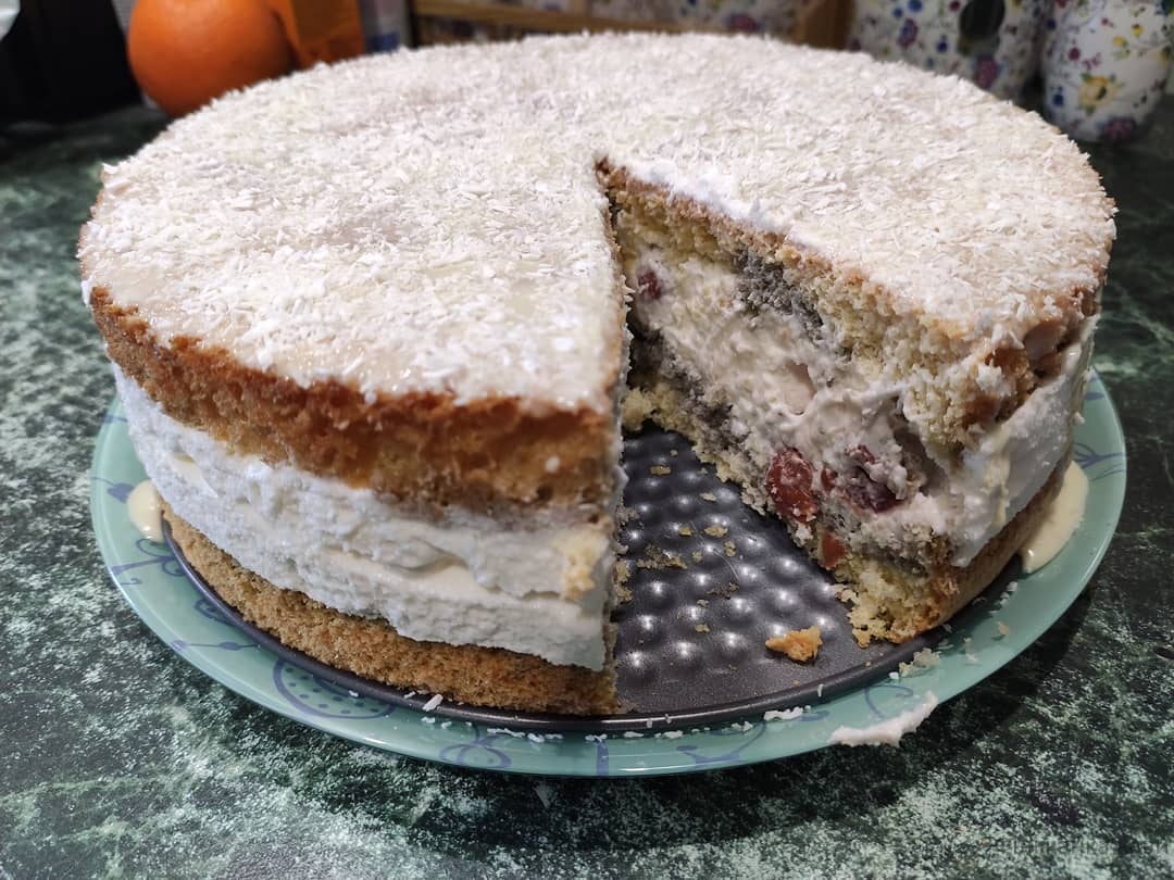 - Зверху прикрасити за бажанням, у мене – розтоплений білий шоколад і злегка присипано кокосом.