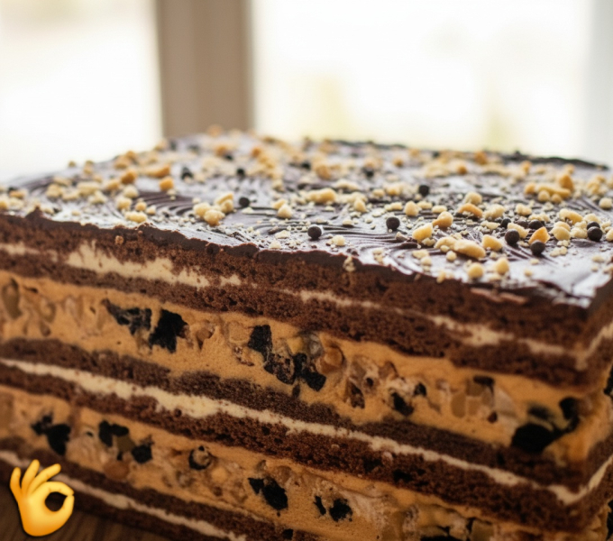 корж +білий крем +корж +крем на згущенці+ безе +крем на згущенці+ корж +білий крем + корж +крем на згущенці+ безе +крем на згущенці + корж +білий крем +корж. Боки-кремом змащуємо і крихтами з коржів присипаємо.