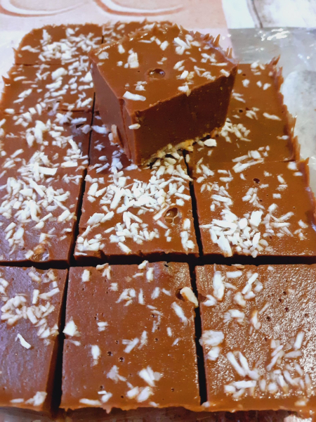Все перебити блендером, викласти в форму застелену плівкою, дно і верх посипати кокосовою стружкою . На 5 годин в холодильник.
