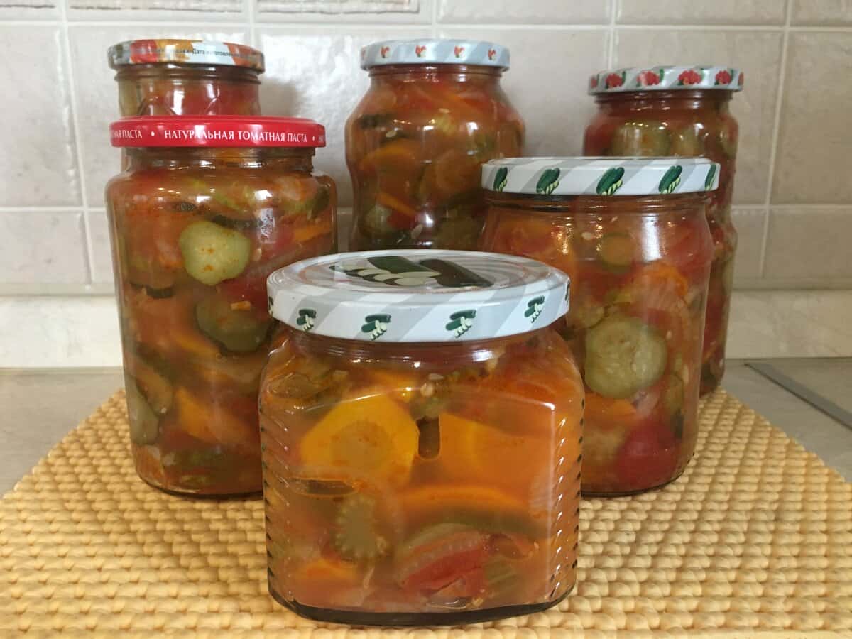 Я цей салат готую вже дуже давно, він прекрасний. Зберігається в кімнаті, готується просто і невигадливо, все нарізала — і готово. Банки з кришками все ж потрібно простерилізувати.