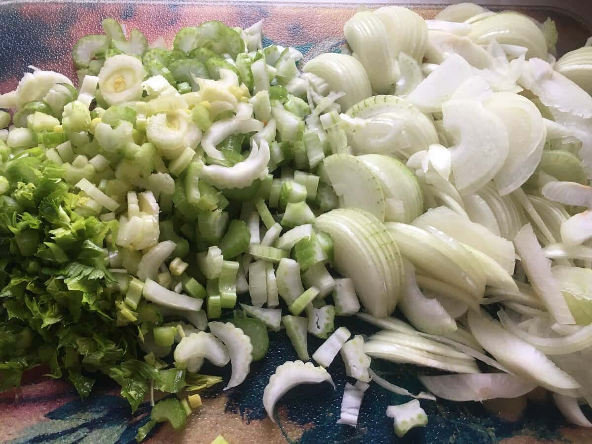 Огірки і моркву мию, очищаю моркву, а огірки очищаю, якщо тільки шкірка груба або з болячками, і нарізаю кільцями або півкільцями. Селеру нарізаю дрібними шматочками, а цибулю — тонкими півкільцями.