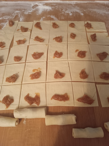 На краєчок кожного квадратика викладаємо повидло, приблизно 0,5 ч.л. і скручуємо в трубочку.