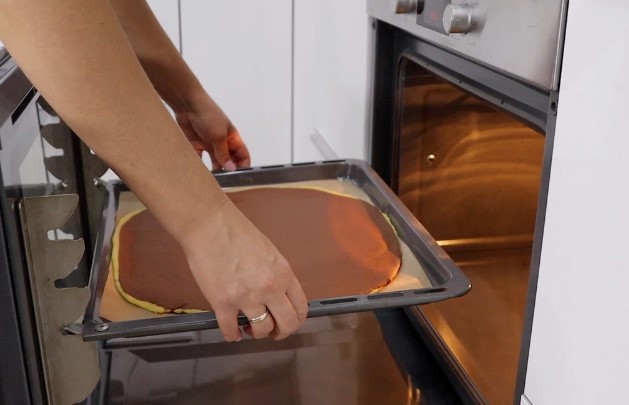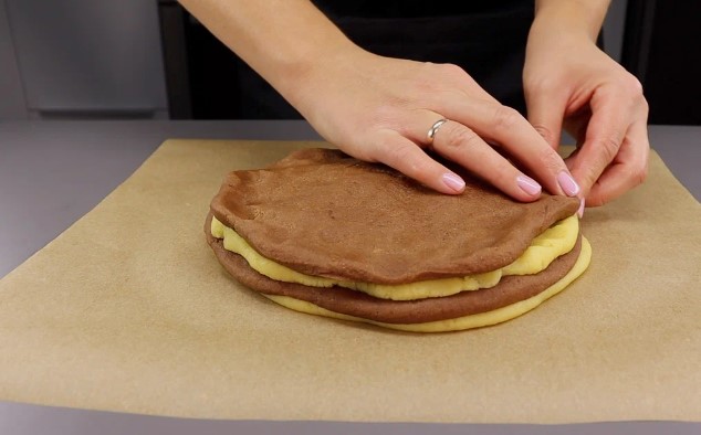 - Один розкачуємо трохи, зверху кладемо шоколадне. Розплющуємо та накриваємо білим. Зверху кладемо шоколадне та розкачуємо пласт товщиною до 5 см.