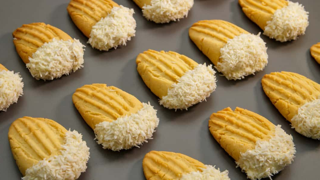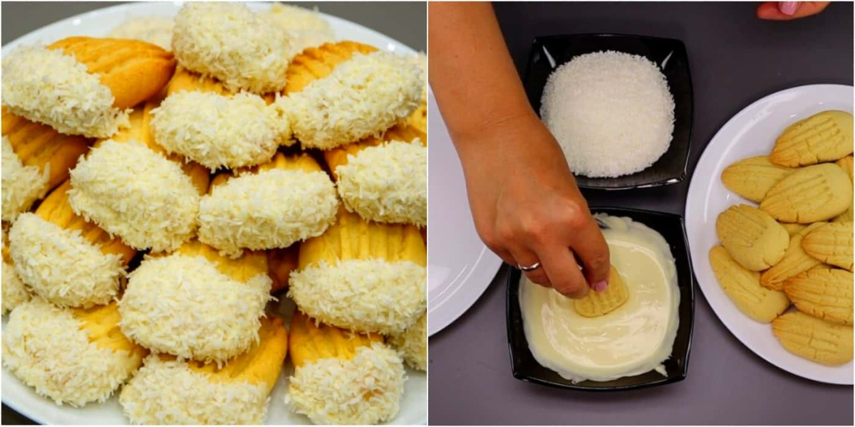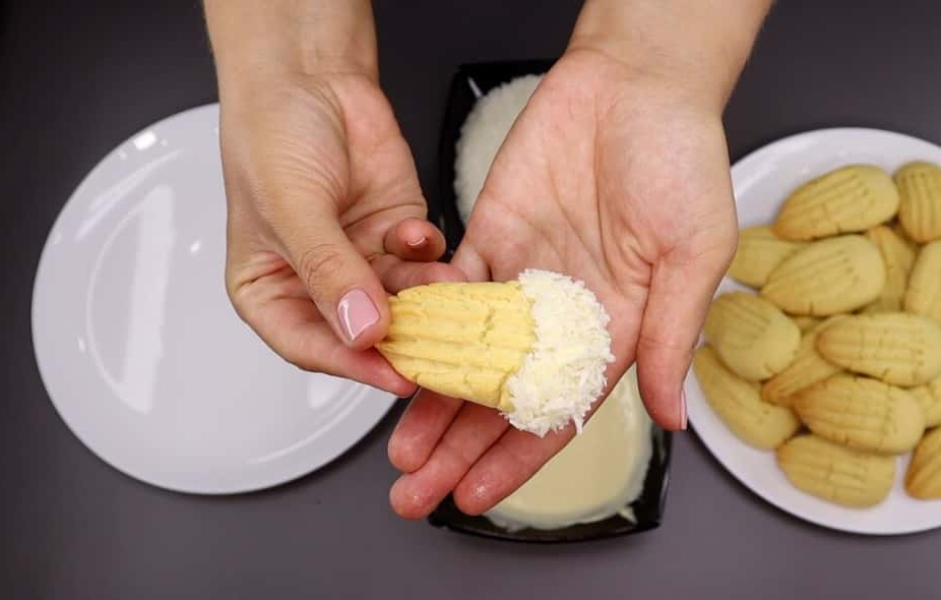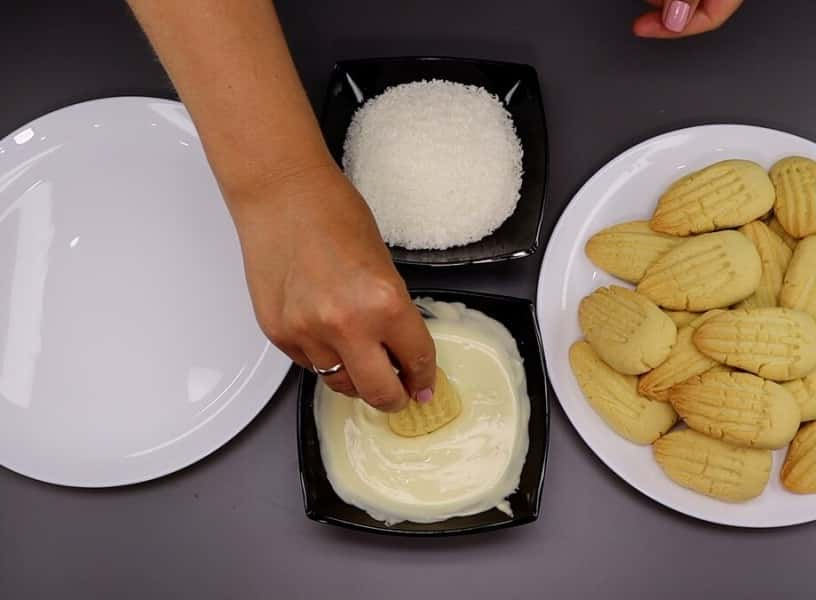 Печиво занурюємо в шоколад широкою стороною, а потім обвалюємо в кокосовій стружці. Теж саме робимо з усіма іншими заготовками.