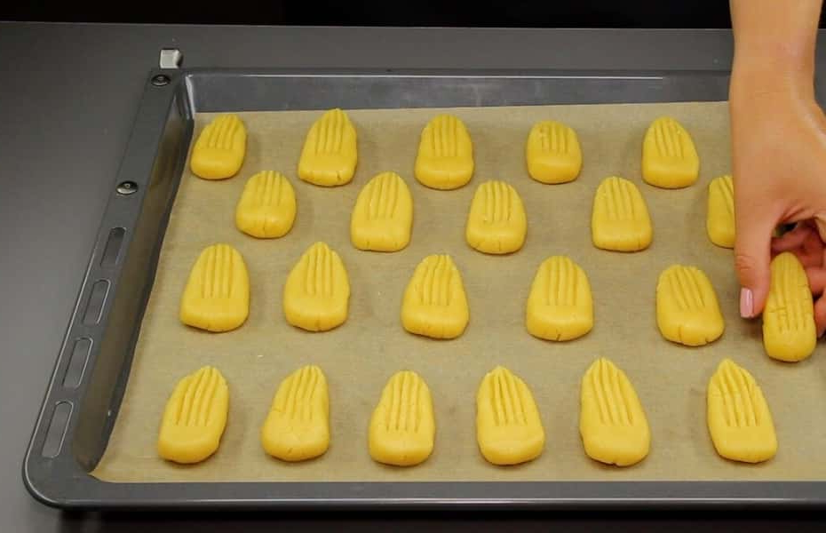 Тепер за допомогою вилки робимо візерунок. Підрівнюємо краї пальцями і перекладаємо заготовки на лист на певній відстані один від одного.