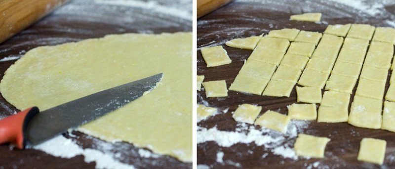 - Товщина шару повинна бути не більше 0,5 см. Якщо розкачати дуже тонко, подушечки вийдуть хрусткими і порожніми всередині. Наріжте тісто на квадратики.