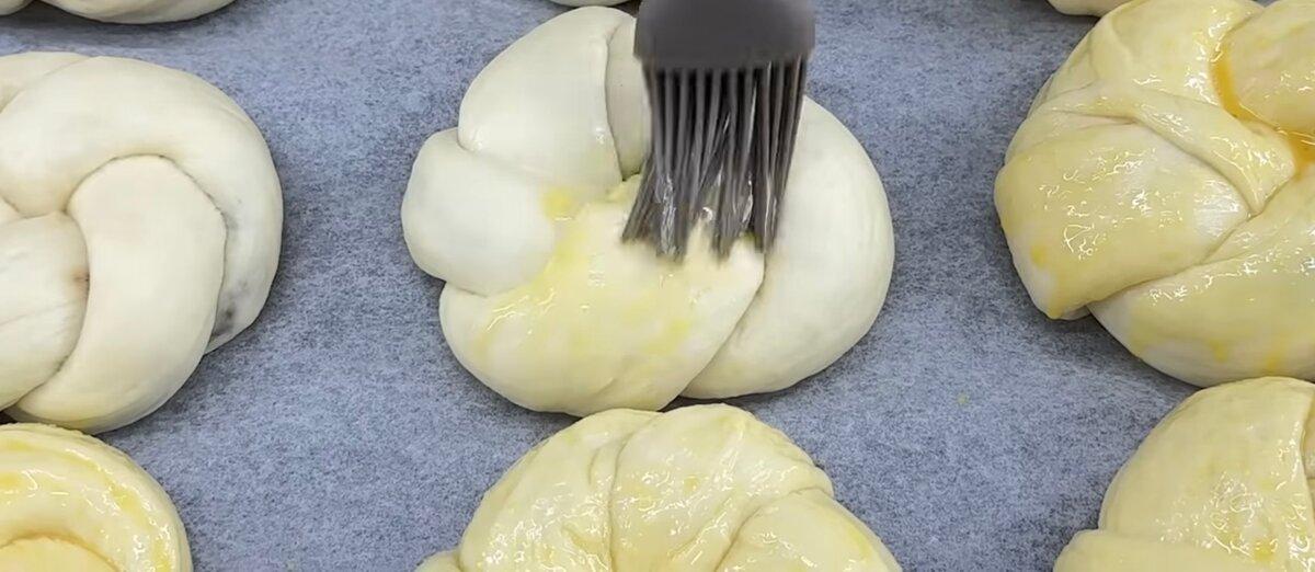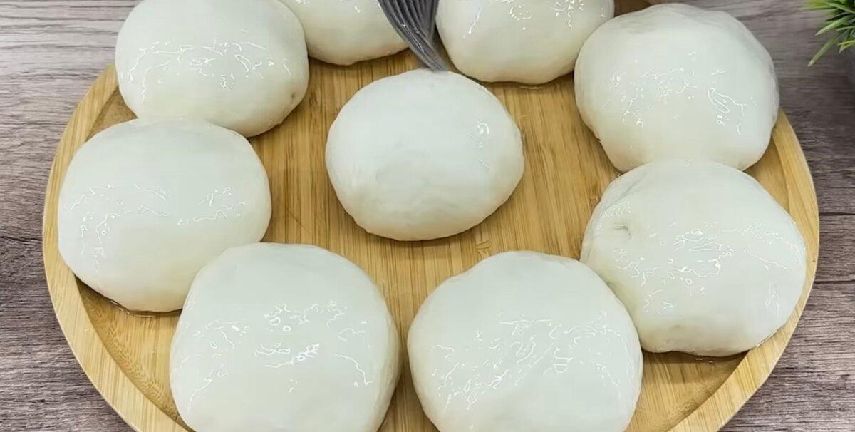 Викладаємо тісто на стіл і ділимо на 9 частин. Шматочки скачуємо в кульки і змащуємо олією. Накриваємо плівкою і залишаємо на 10 хв.