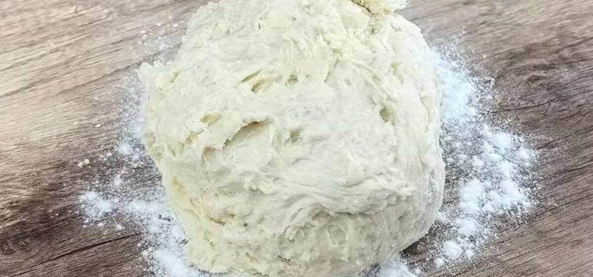 Вливаємо білок і перемішуємо. Просіюємо борошно, додаємо сіль, розмішуємо лопаткою і замішуємо тісто. Викладаємо на стіл ( присипаний борошном ) і місимо 5 хв.