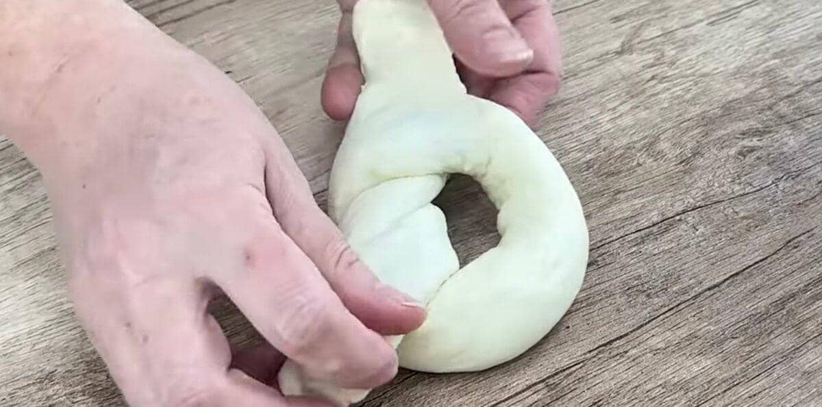 Звертаємо в трубочку і трохи її розкачуємо, щоб була тоншою. Зав’язуємо вузлом, хвостики пропускаємо через дірку і защеплюємо краї.