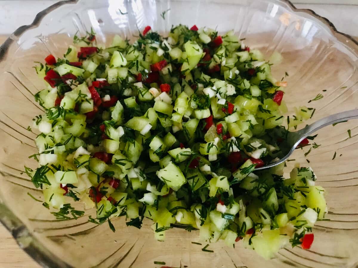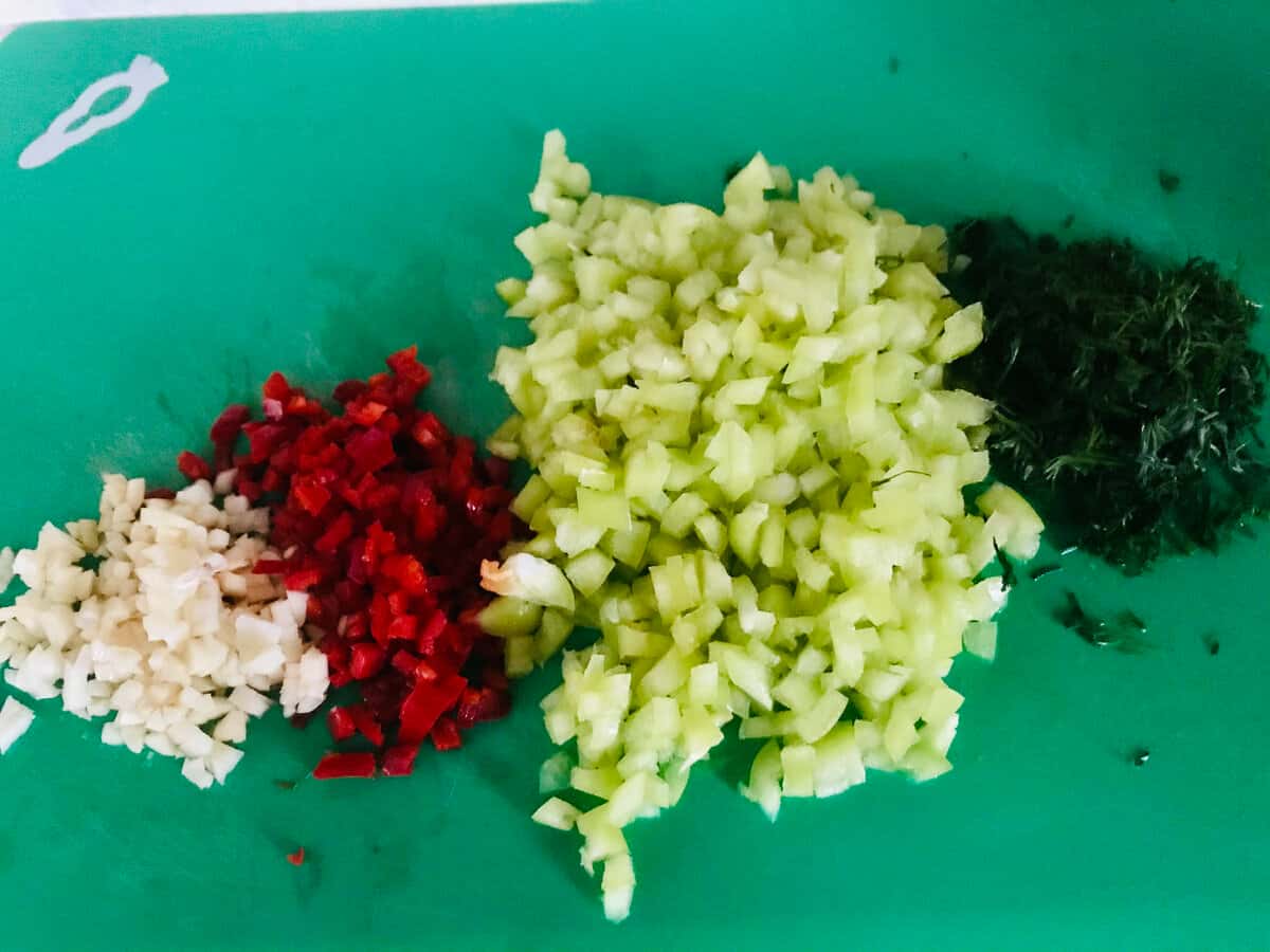 Часник нарізаю дрібно. З перців видаляю насіння ( якщо любите дууже гостре — насіння можна залишити ). І гострий перчик, і солодкий нарізаю дрібними кубиками. Зелень подрібнюю. Все це можна подрібнювати не ножем, а перемолоти в блендері.