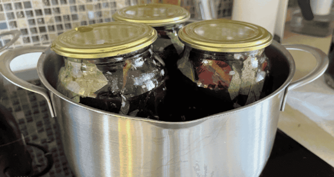 Тим часом ставимо банки на стерилізацію. А кришки обдаємо окропом.