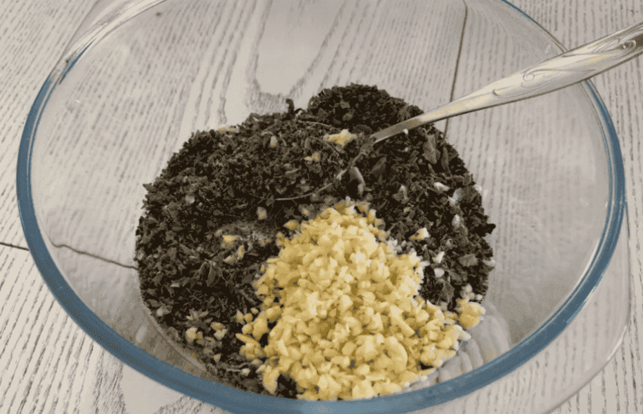 Змішуємо часник із м’ятою (4 ст. л. на літрову банку). Додаємо трохи чорного меленого перцю і чилі, можна замінити паприкою.