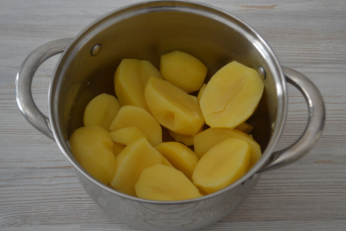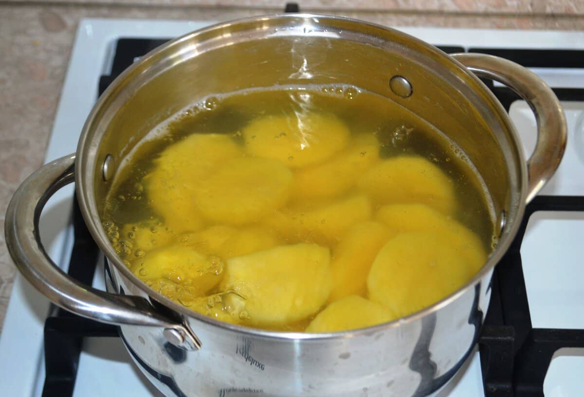 Поки приготуємо начинку. Для цього відваримо очищену картоплю в підсоленій воді. Потім всю воду солимо, картопля мнемо товкачем до пюре.