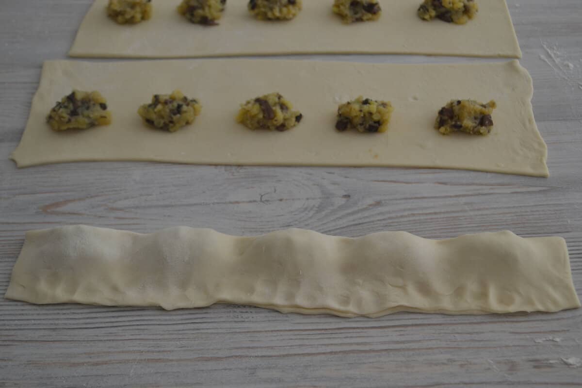 Викладемо обсмажені гриби з цибулею в картопляне пюре і добре перемішаємо. Начинка готова, починаємо ліпити вареники. Тісто ділимо на кілька частин, розгортаємо кожну частину в тонкий пласт.