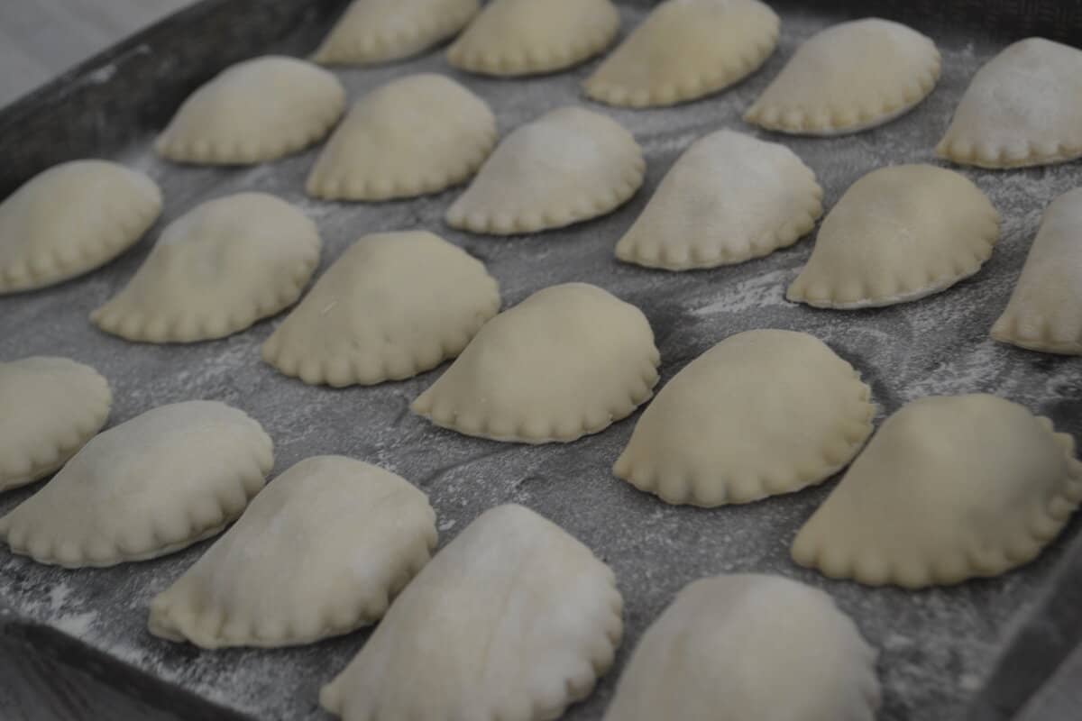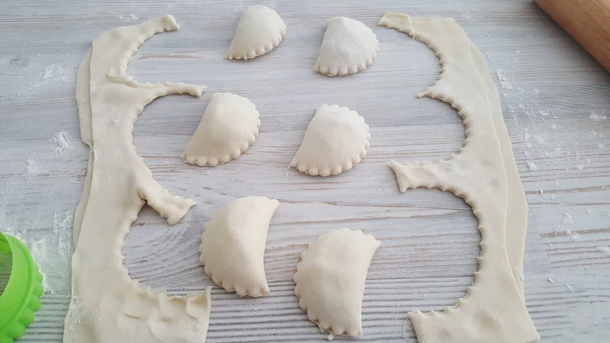 Тісто складаємо, накриваючи начинку. Притискає тісто пальцями і вирізаємо вареники за допомогою склянки або форми.