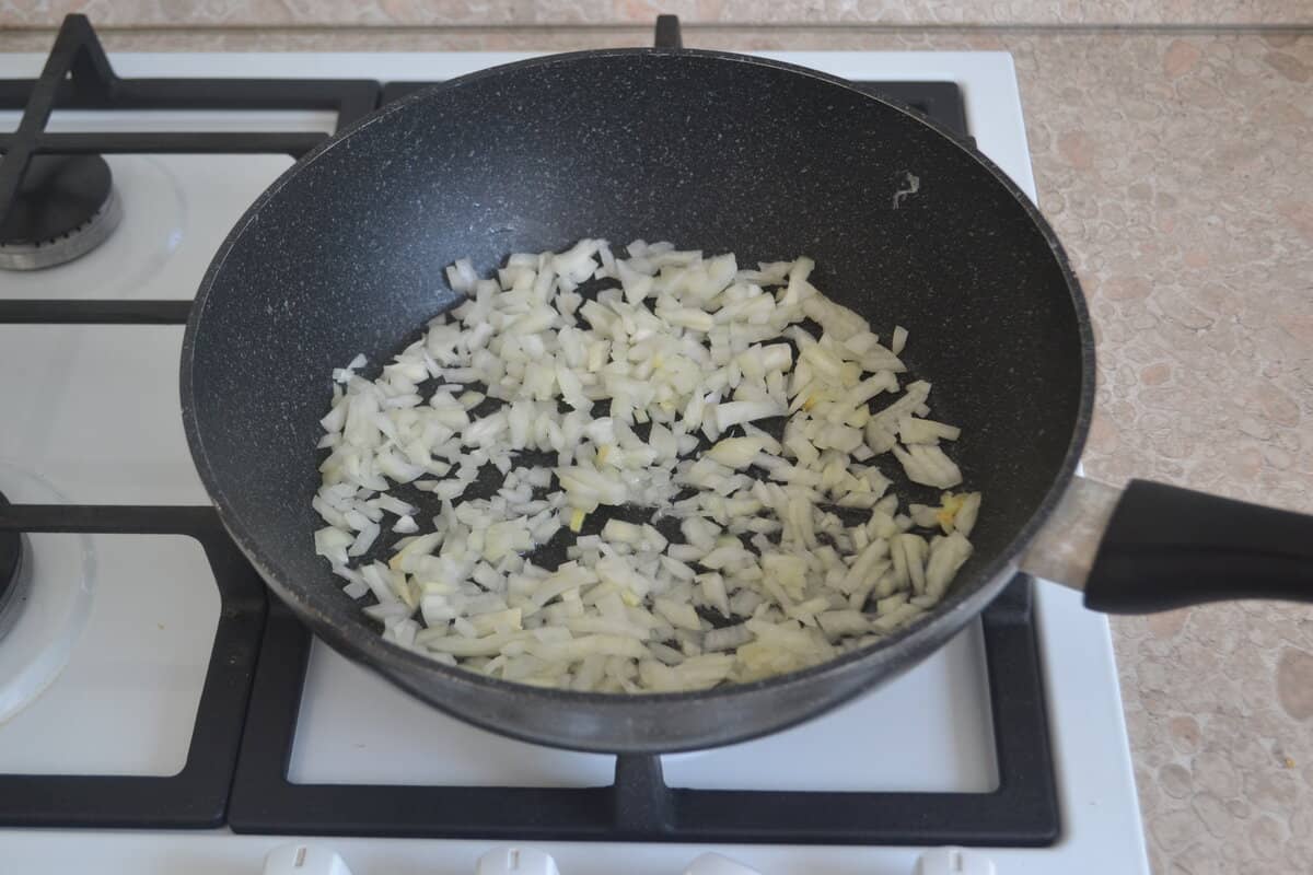 Цибулю наріжемо дрібним кубиком і обсмажити на олії до м’якості.