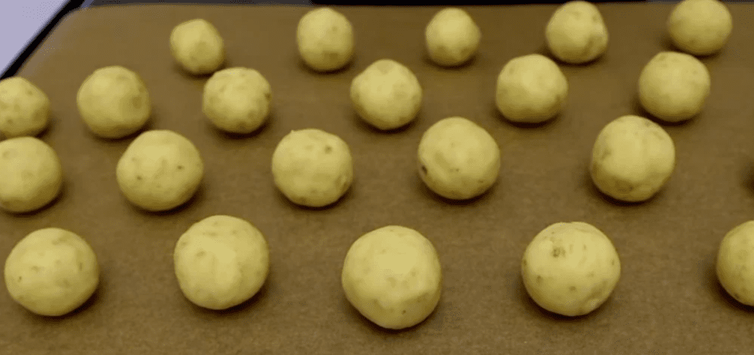 - Потім з тіста формуємо кульки невеликого розміру і викладаємо на деко, заздалегідь застелене папером для випічки. Відправляємо у розігріту до 170 градусів духовку – на 18 хвилин.
