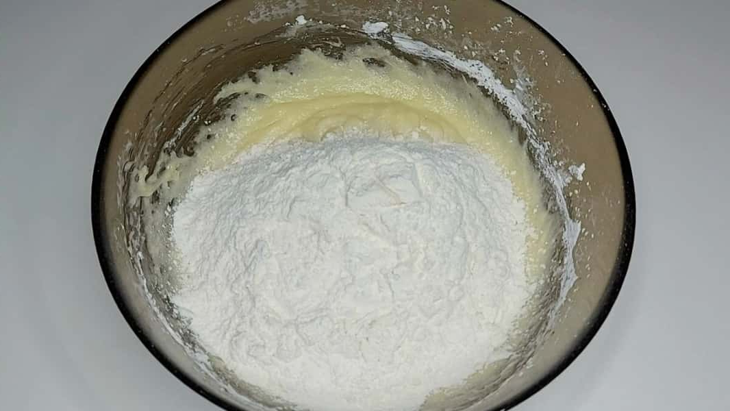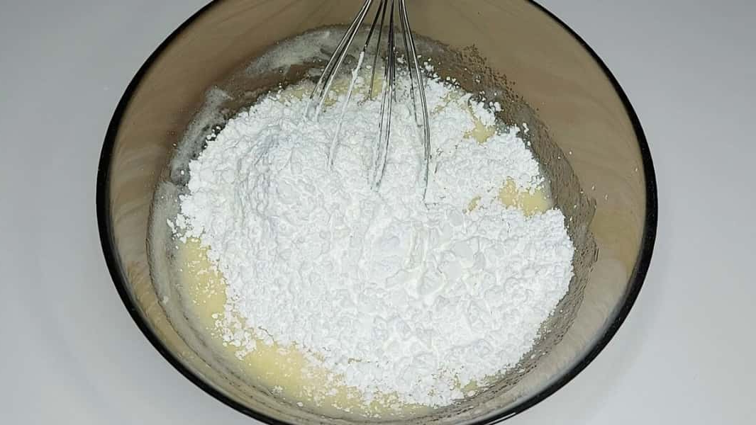 3. Потім додати крохмаль та розпушувач. Замість кукурудзяного крохмалю можна використовувати картопляний. Ретельно перемішати до однорідної маси.