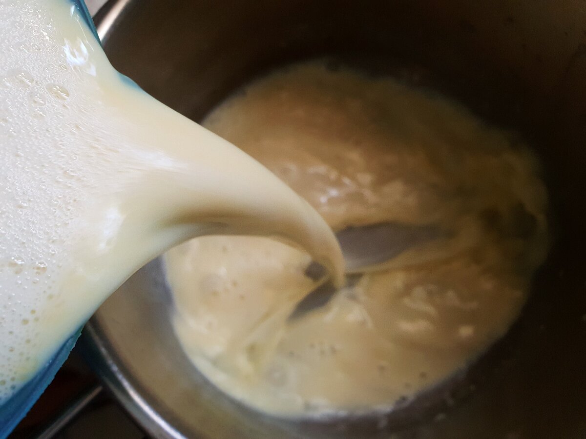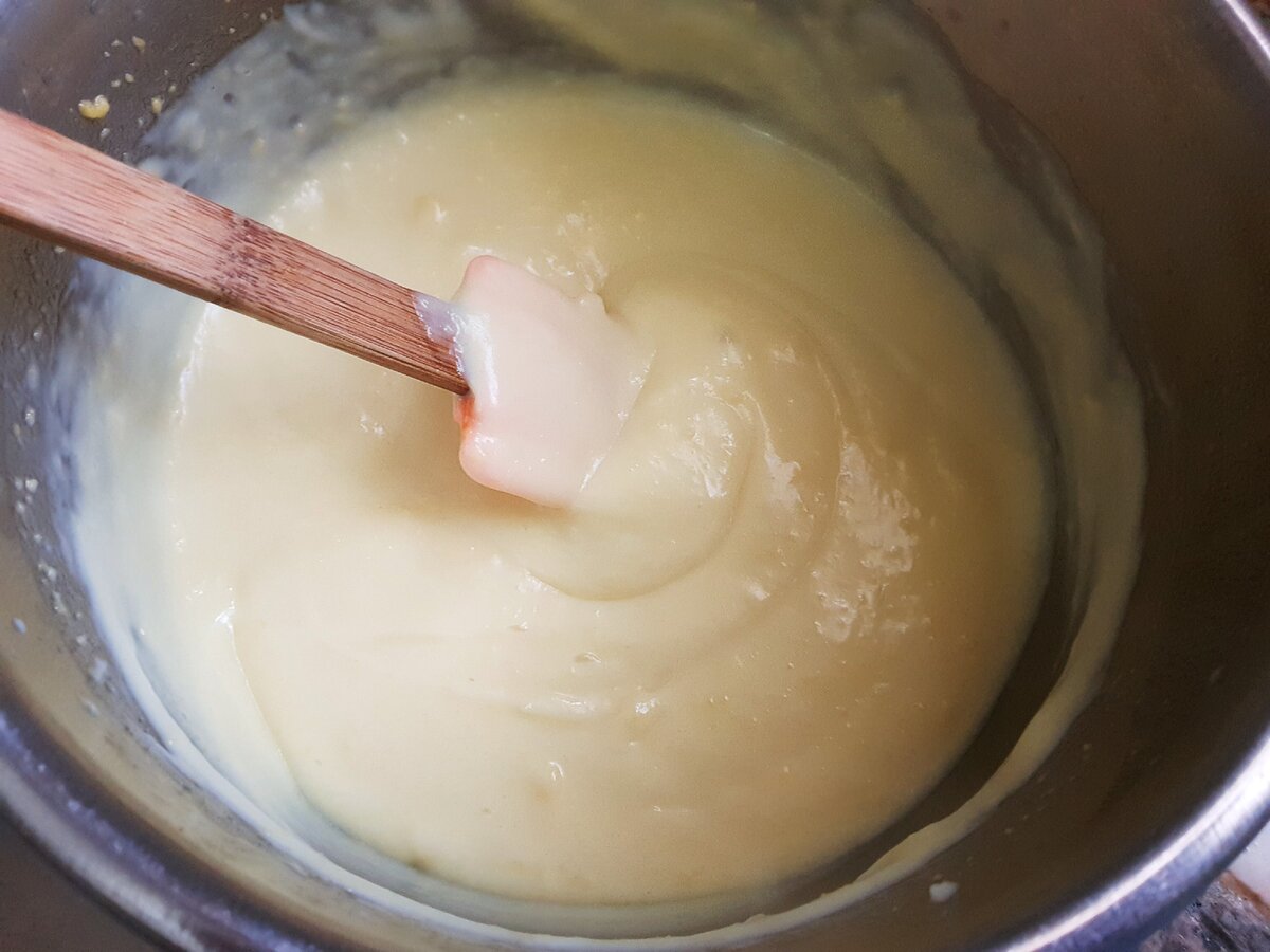 5. Отриману суміш влийте назад в сотейник, де грілося молоко. Варіть на середньому вогні до загустіння. Не забувайте помішувати. Зазвичай це займає не більш п’яти хвилин.