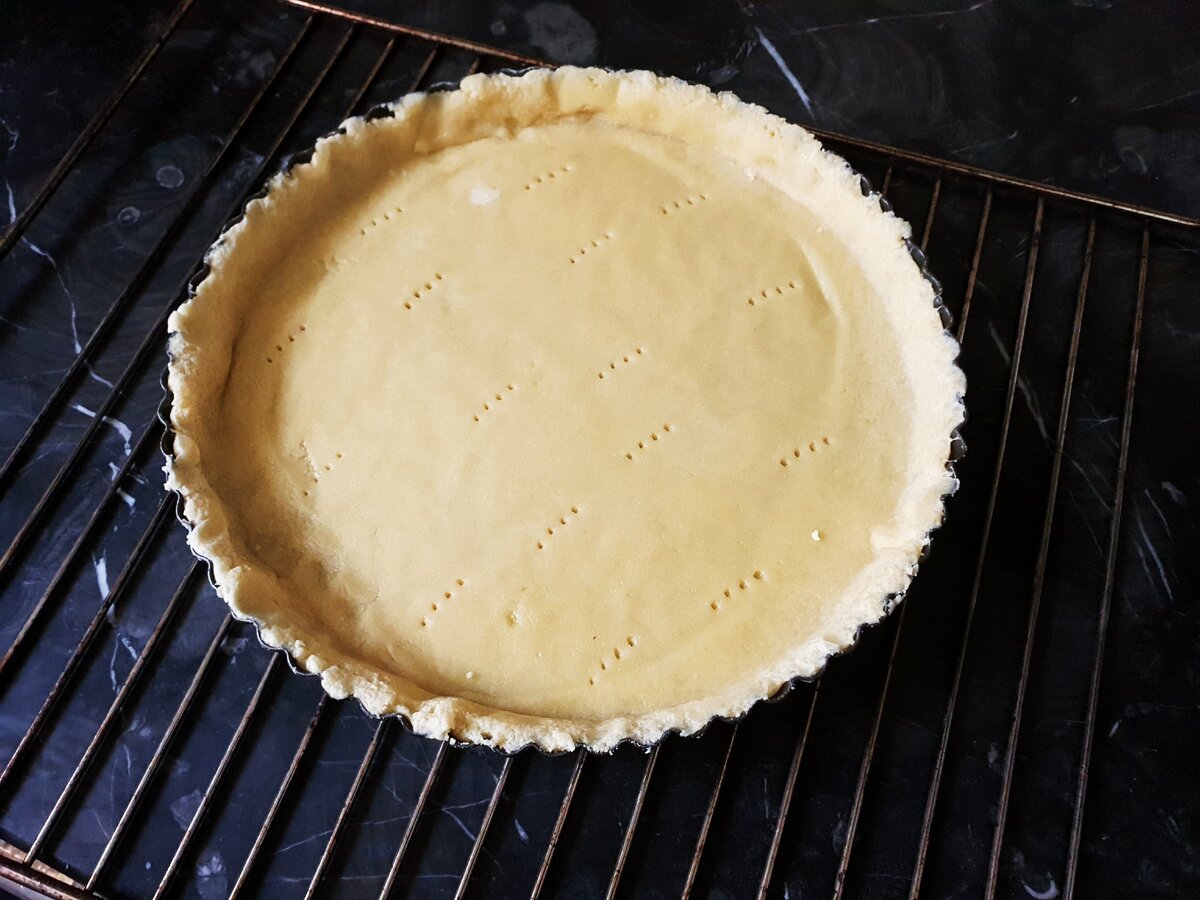 9. Випікайте пиріг при температурі 160-170 градусів приблизно 15 хвилин. Потім зніміть «вантаж» і папір, проткніть виделкою тісто в декількох місцях. Після відправте допікатися пиріг ще хвилин на 10-15. Коли випічка підрум’яниться, вийміть її з духовки і дайте охолонути.