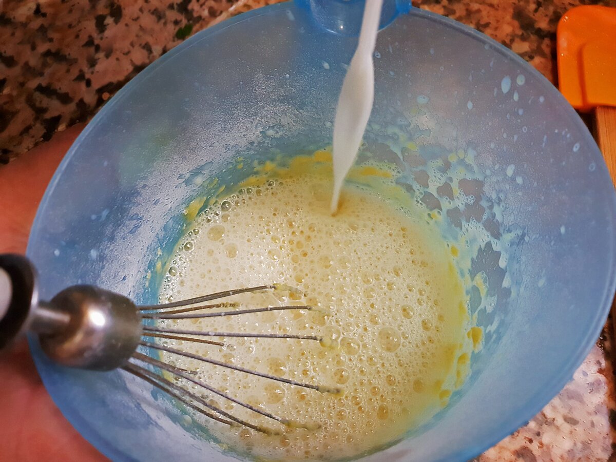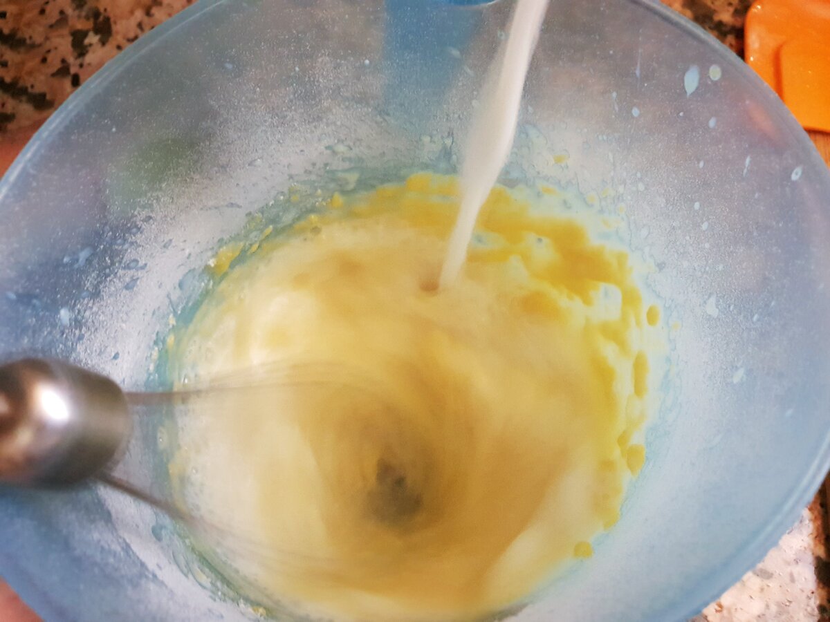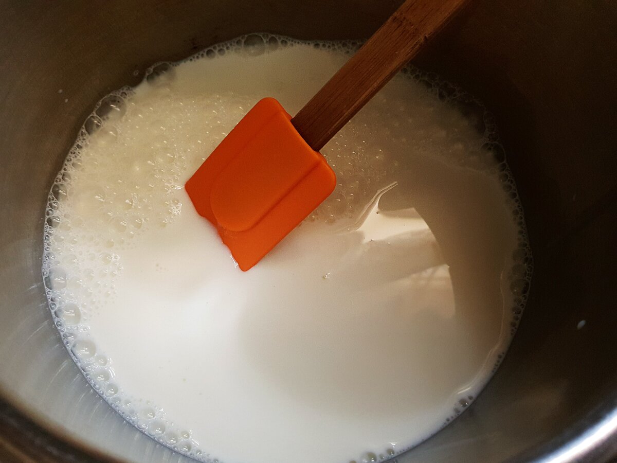 4. Молоко прогрійте з цукром приблизно до 70-80 градусів і влийте тонкою цівкою в яєчні жовтки, постійно збиваючи або інтенсивно помішуючи.