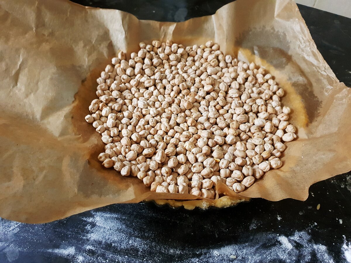 8. Накрийте тісто пергаментним папером і покладіть зверху «вантаж». Ним може бути квасоля, звичайний горох або нут. Це потрібно зробити, щоб тісто не піднімалося при випічці і тримало форму. Використану квасолю або горох не викидайте, зберігайте в спеціальній банці або пакеті для майбутньої випічки.