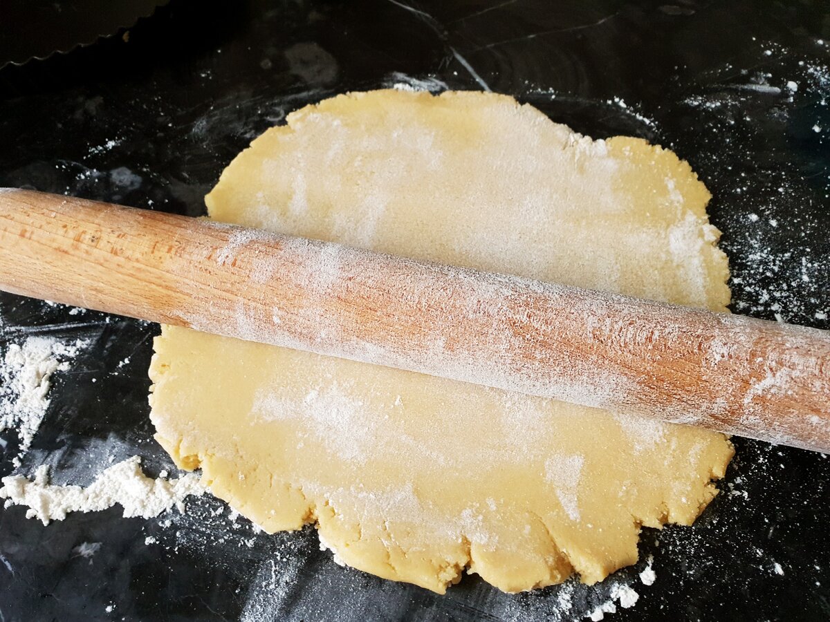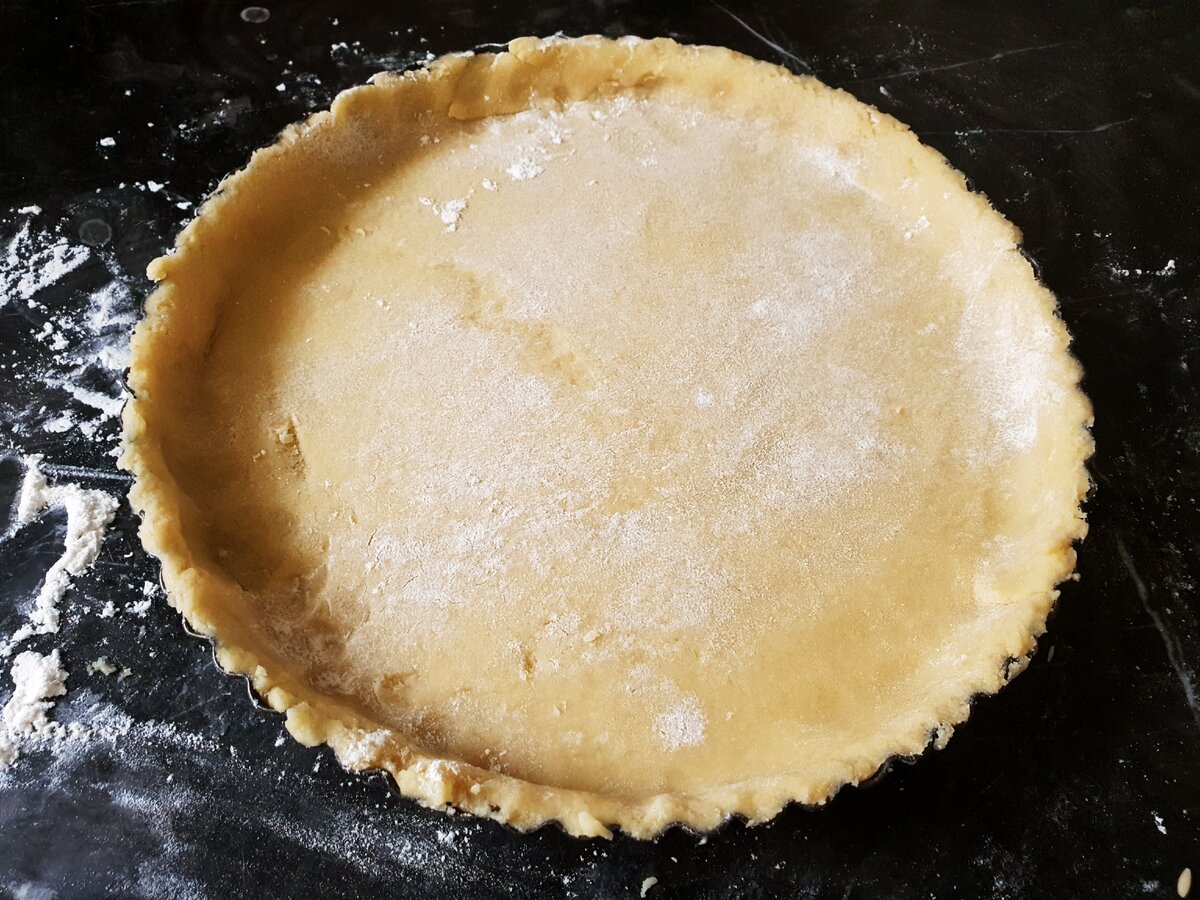 7. Увімкніть духовку на розігрів. Тісто розкачайте товщиною приблизно 5-7 мм і перекладіть в форму для запікання. Краї підрівняти.