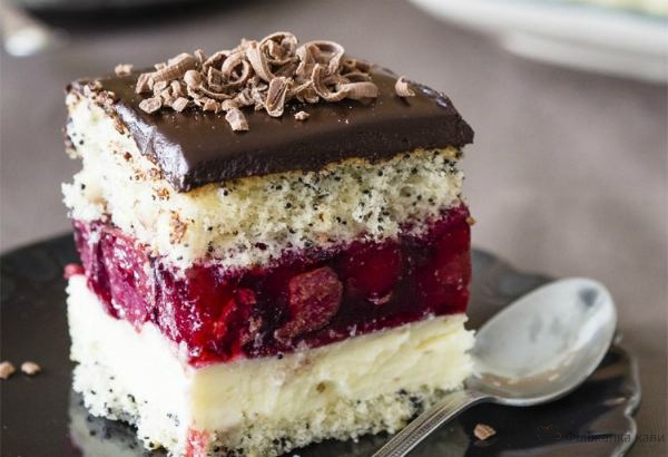 Відокремити білки від жовтків. В окремій мисці збити білок з дрібкою солі. В окремій мисці змішайте яєчні жовтки з олією і водою. Просіяти борошно з розпушувачем. До майже збитих білків по частинах додати цукор. Збити до високих піків. Далі додайте яєчні жовтки, перемішайте, додайте борошно з розпушувачем і в самому кінці мак. Форма 24 х 35 см, викладена папером для випічки. Випікати близько 35 хв. Охолодити і розрізати на 2 коржі.