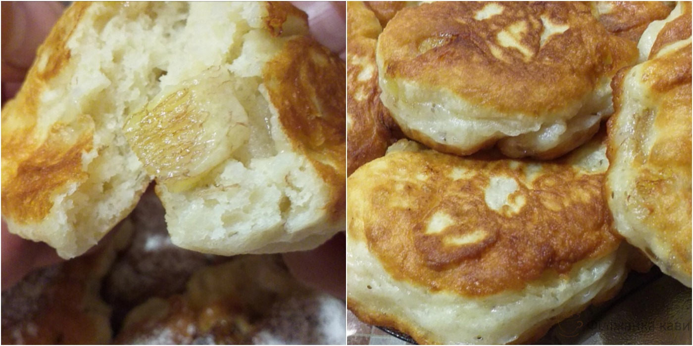 Фрукти перемішуємо з тістом і смажимо як звичайні оладки на сковороді. Дріжджові оладки при смаженні чудово піднімаються, стають повітряними і пишними.