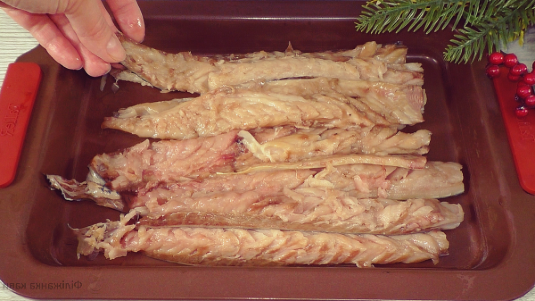 Відокремити від кісток, але це не обов’язково, можна просто нарізати порційними шматочками. Я обробляю на філе і кожне філе ділю на дві частини.