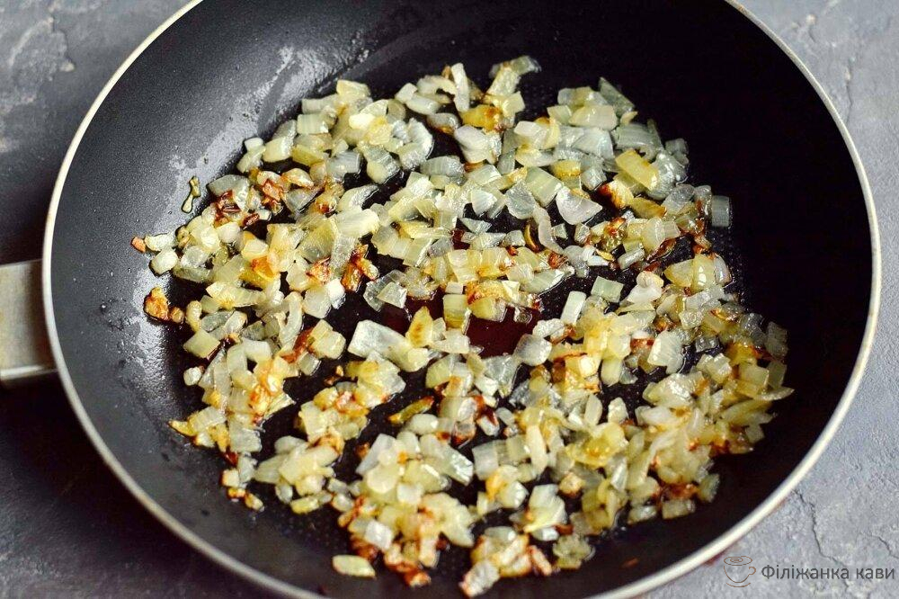 Одночасно приготуйте до галушок цибульну засмажку. Головку цибулі очистіть, наріжте кубиками, обсмажте в олії до м’якості і придбання рум’яної скоринки.