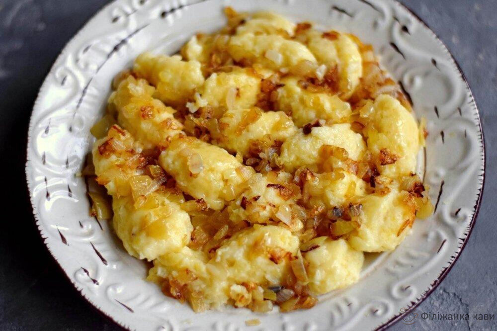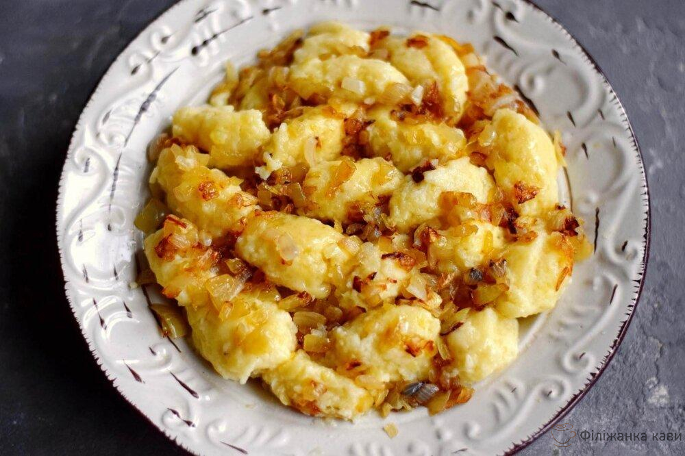 Страву можна подати на стіл зі сметаною або полити її цибульною зажаркою, своїм яскравим смаком вона відмінно доповнює картопляні галушки.