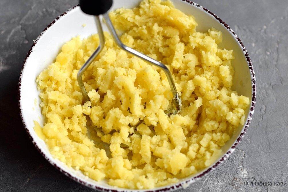 Бульби картоплі очистіть, відваріть в підсоленій воді до готовності. Варену картоплю розімніть товкачем в пюре.