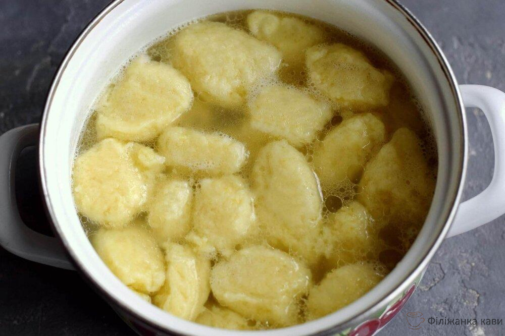 Заздалегідь в кастюлі закип’ятіть воду, посоліть. У вируючу воду по черзі опустіть картопляні вироби. Вогонь постійно тримайте на високому рівні. Після того, як галушки спливуть на поверхню, відразу їх дістаньте шумівкою.