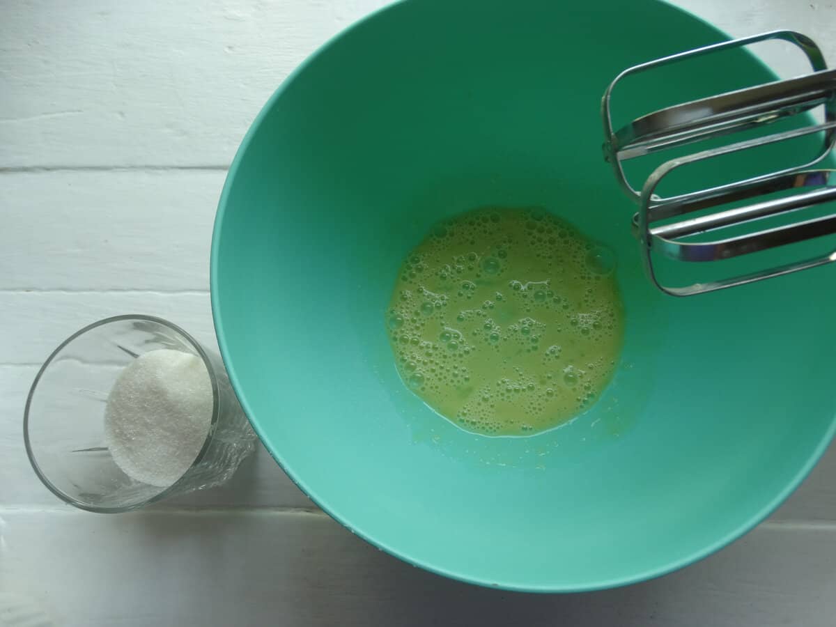Поступово в миску вводимо цукор. Збиваємо яйце до щільної піни, і поки ця піна не посвітлішає.