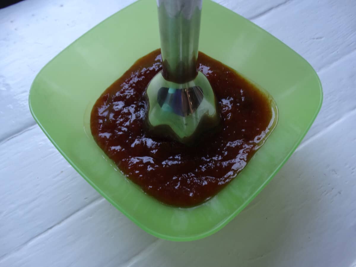 Спочатку подрібнюємо абрикосове варення занурювальним блендером.