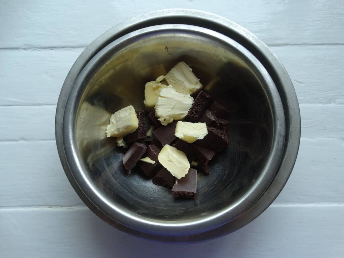 А поки в миску складаємо шматочки шоколаду і вершкове масло. Ставимо миску на водяну баню. Розтоплюємо, періодично перемішуючи вміст миски, щоб рівномірно все прогрівалося.