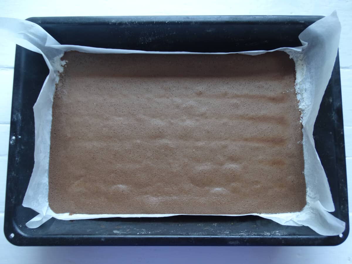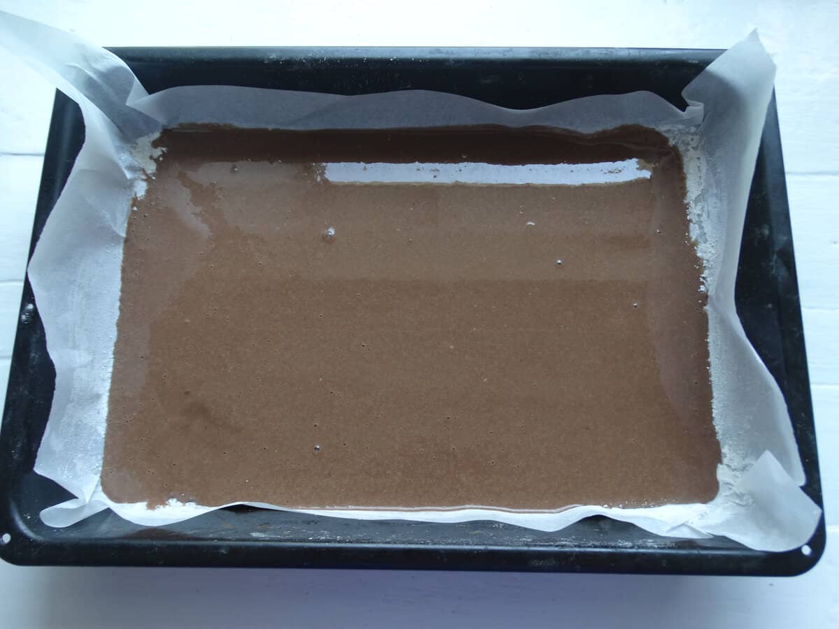 Тісто готове. Перевалюємо його в підготовлену форму і ставимо в духовку. Температура в духовці вже повинна бути 180 ⁰. Випікаємо тонкий бісквіт хвилин 15-17.