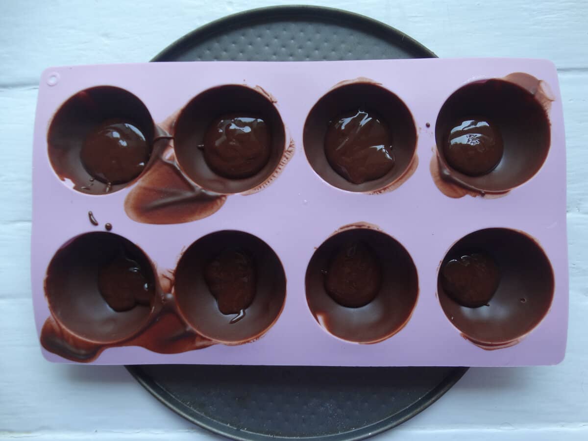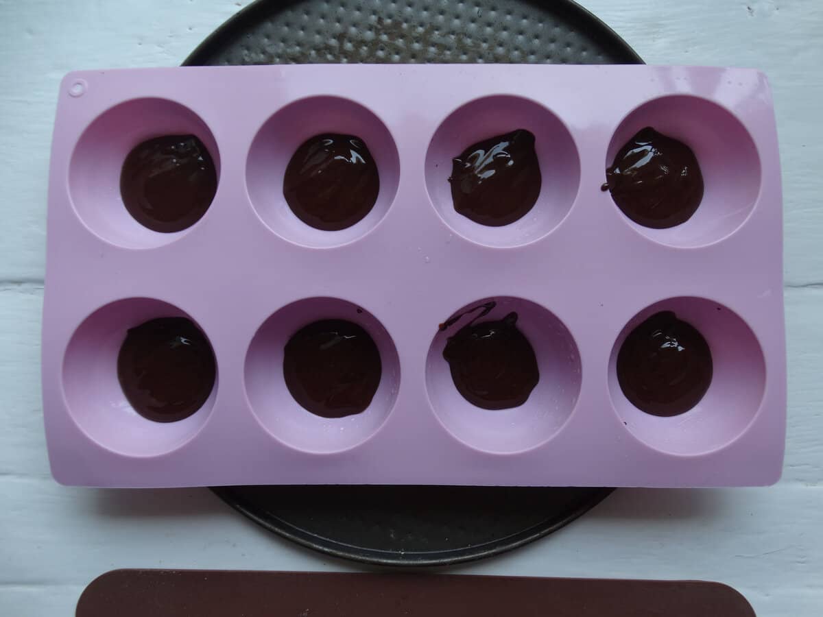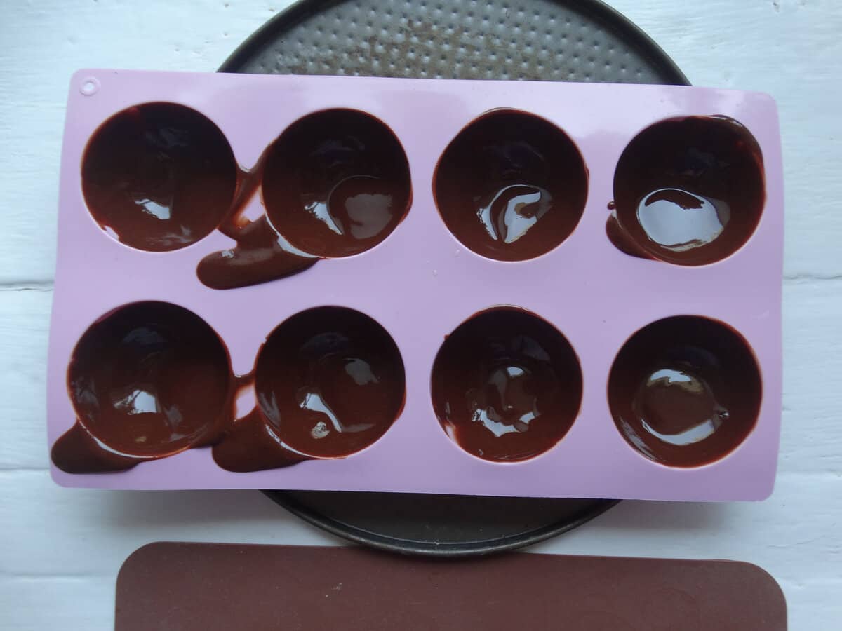 Обертаючими рухами перевертаємо форму, щоб шоколад рівномірно розподілився по поверхні сфер.