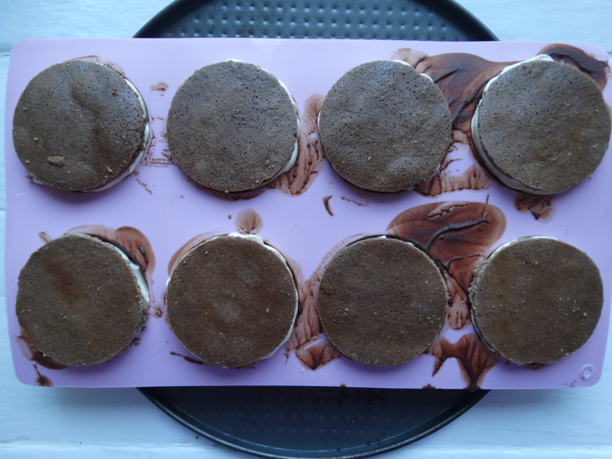 Накриваємо кожне тістечко заготовкою з бісквіта, і трохи вдавлюємо бісквіт в зефір, щоб зафіксувати.